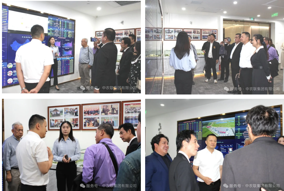 泰方一行首先参观了中农联全球农产品流通数字大屏,大屏实时展示全球农产品供应链动态,清晰呈现大米、白糖、牛肉、鸡爪、猪肉、玉米、小麦等关键农产品的流通路径与市场趋势,为双方合作奠定坚实数据基石。