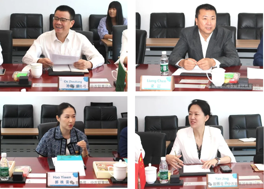 在民盟中央社会服务委员会副主任、企联会常务副会长兼秘书长洪宇,中农联集团执行总裁周士林、集团副总裁池周康、供应链管理公司董事长闫静、投资发展中心总经理许彤的热情接待下,进行友好的商务洽谈。